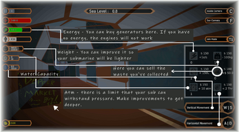 - Water Tanks: You can control the level of submarine by fill/empty the water tanks - it consumes Energy.. In order to go deeper and faster, increase the water tank capacity - if your weigth bar is "gray" (read ligther) and you reach the max capacity, you would not be able to go down.