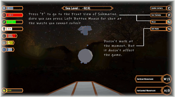 - Pressure : Each 10m down, will increase 1 atm. In order to go deep, you must make improvements at the sub. Be careful, if you are at a higher pressure that you can handle, go up bufore the hull is completely damaged.